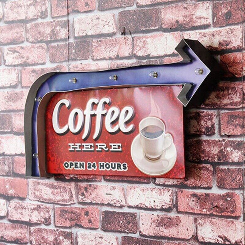 送料無料 LEDライト ネオンサイン メタル ブリキ 看板 Coffee HERE Cafe 喫茶店 OPEN 24 HOURS 矢印 インテリア ディスプレイ 輸入雑貨