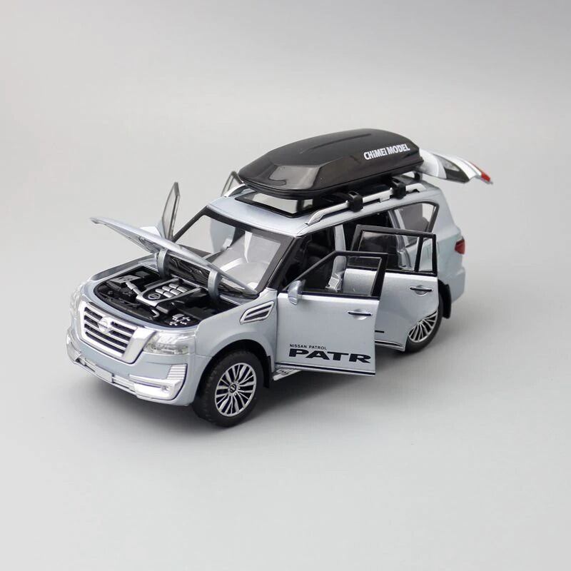 送料無料 1/32 日産 サファリ パトロール 大型高級SUV 銀 シルバー ルーフキャリア ルーフボックス ミニカー ダイキャストカー モデルカー