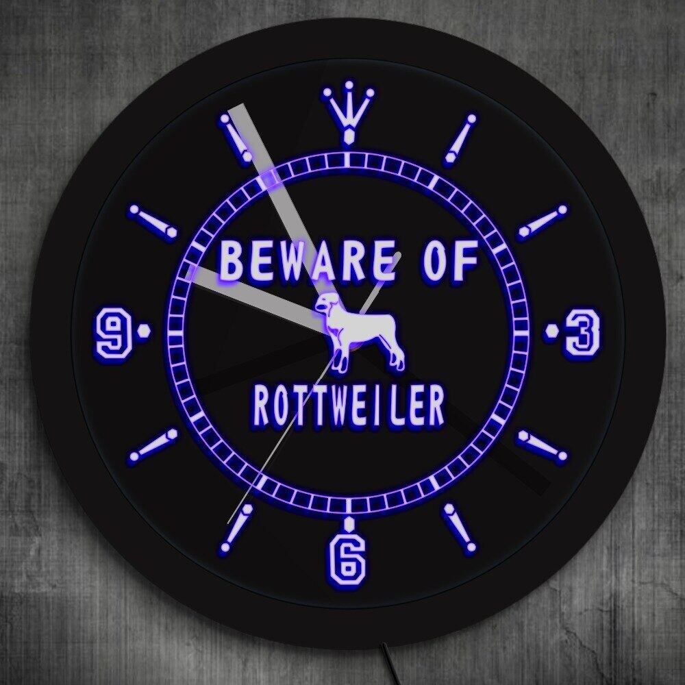 壁掛け時計 LEDライト ネオンサイン BEWARE OF ROTTWEILER ロットワイラー 注意 カラフル レインボー おしゃれ エコ インテリア 輸入雑貨