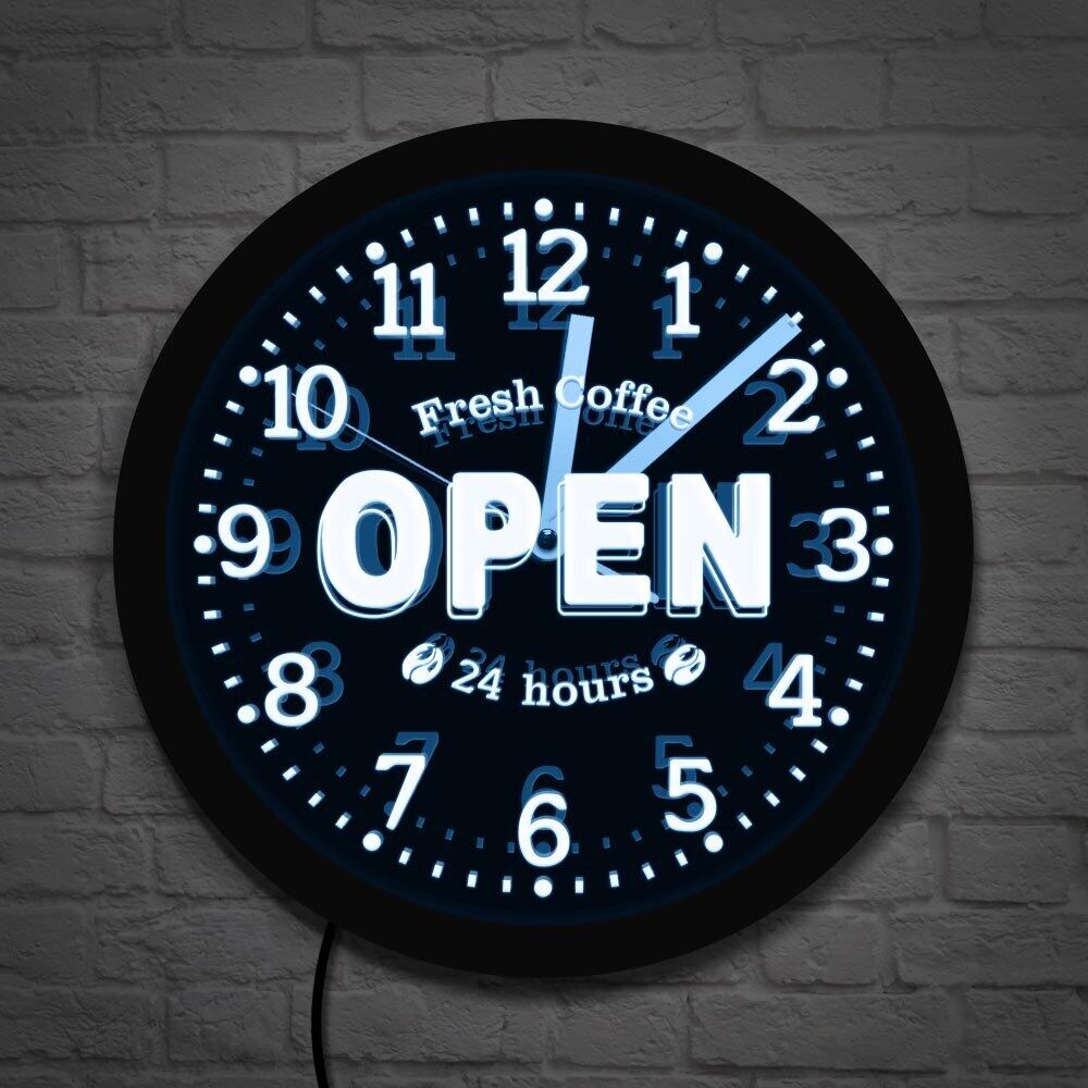 壁掛け時計 LEDライト ネオンサイン OPEN Fresh Coffee 24hours カフェ カラフル レインボー おしゃれ インテリア ディスプレイ 輸入雑貨