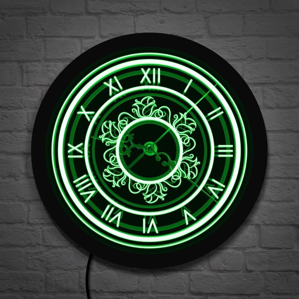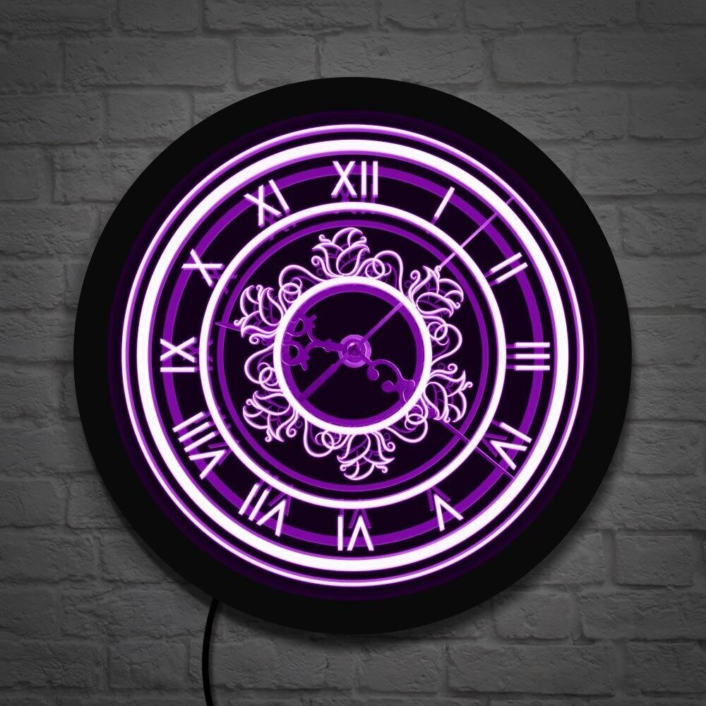 壁掛け時計 LEDライト ネオンサイン ローマ数字 ラテン文字 アラビア数字 花びら柄 レインボー インテリア ディスプレイ アート 輸入雑貨