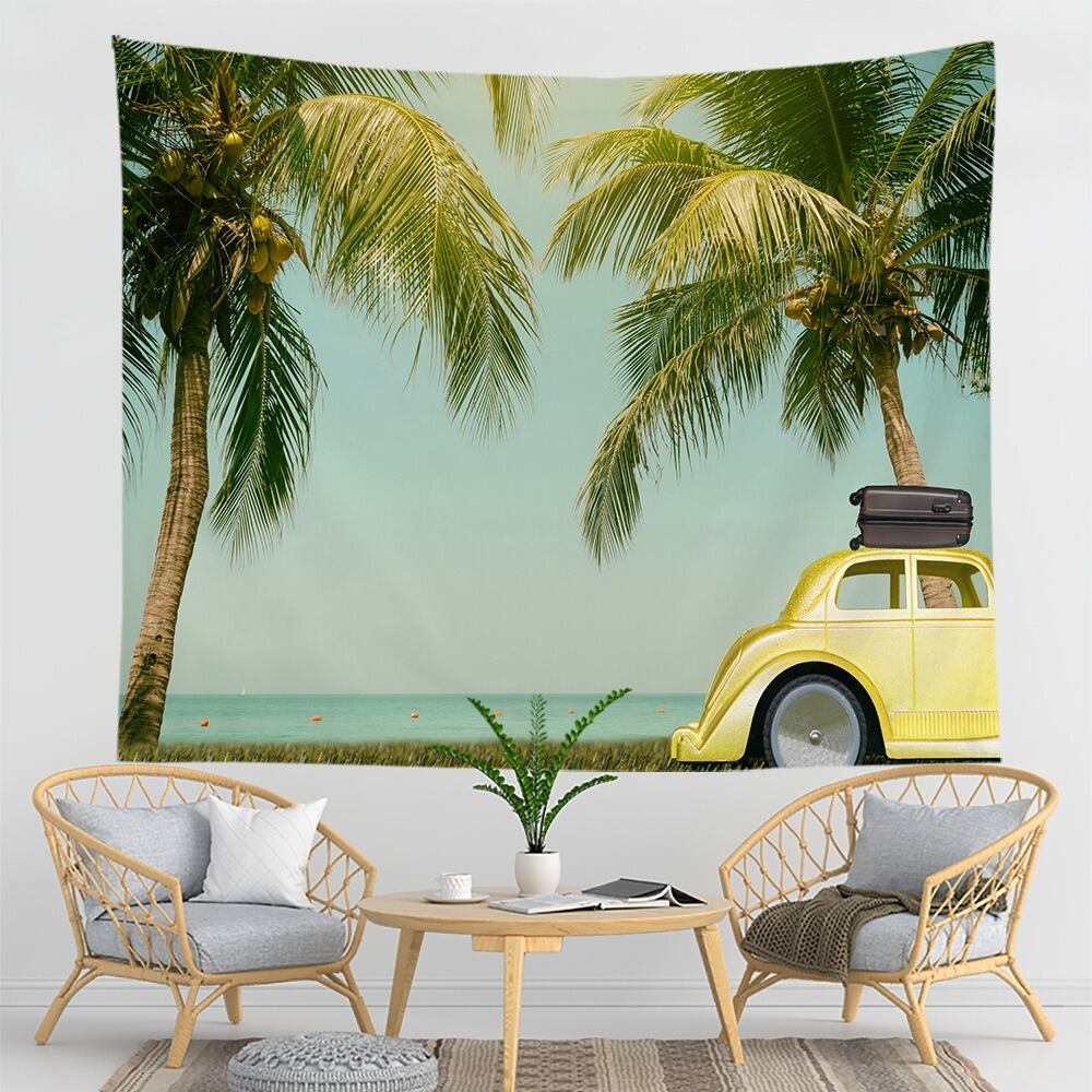 タペストリー 海 ビーチ 砂浜 ヤシの木 ビートル クラシックカー 黄色 イエロー スーツケース キャリーケース 旅人 ドライブ 夏 Summer ディスプレイ アート 輸入雑貨 プレゼント ギフト インテリア 人気 おしゃれ 日本未発売
